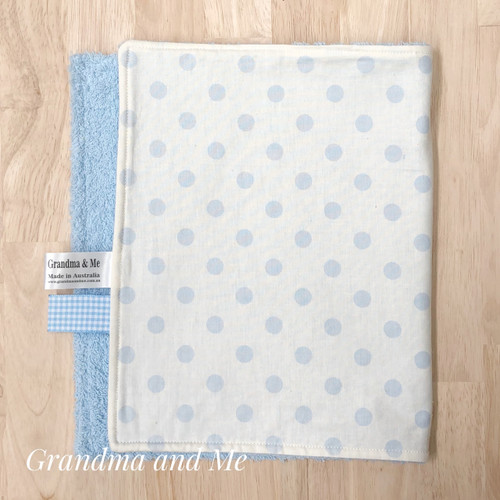 Pale blue spots adorn the cotton front with blue towelling on the back. The perfect size for mopping up little messes from your newborn. Our burping rugs can also double as a changing mat when out and about. These are an in stock item.