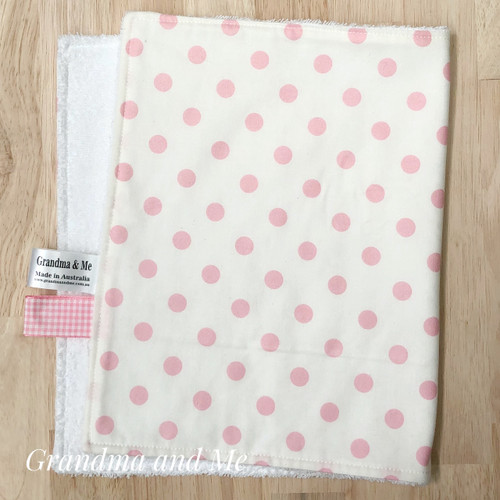 Pale pink spots adorn the cotton front with white towelling on the back. The perfect size for mopping up little messes from your newborn. Our burping rugs can also double as a changing mat when out and about. These are an in stock item.