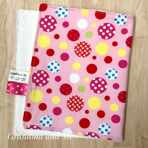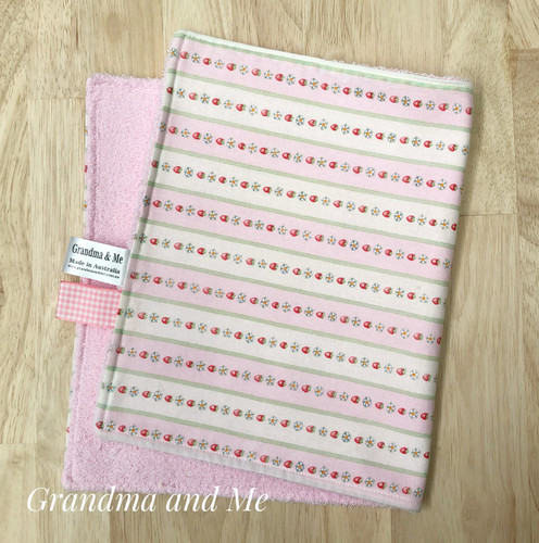 A delightful Alphabet design cotton front with white towelling on the back. The perfect size for mopping up little messes from your newborn. Our burping rugs can also double as a changing mat when out and about. These are an in stock item.